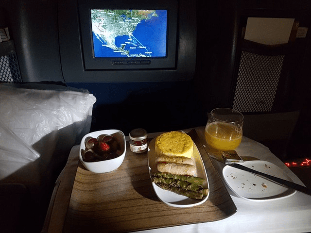 Caso esteja cansado, você tem a opção de solicitar o Dine & Rest, e o comissário vai trazer todo seu jantar de uma vez só. Porém as opções de entrada e sobremesa acabam sendo bem menores que o normal. Na volta eu acabei fazendo essa opção para poder dormir logo.