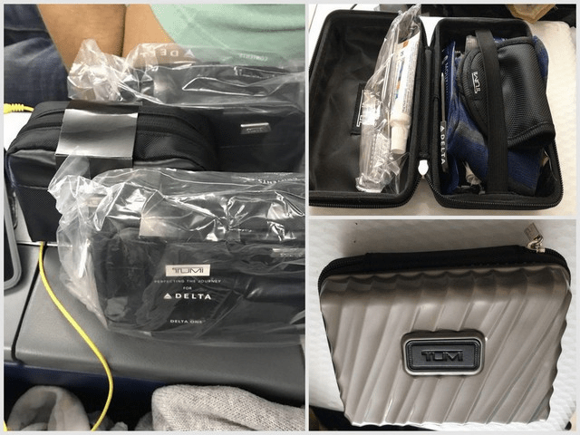 Não posso esquecer de falar do kit de amenidades. Era uma necessaire da TUMI para cada um. Dentro dela tinha kit higiene dental, meias, tampões de ouvido, pente, máscara para dormir, lenços umedecidos e uma caneta. Na ida ganhamos essa necessaire molinha e na volta, a rígida. Mas o conteúdo das duas era o mesmo.
