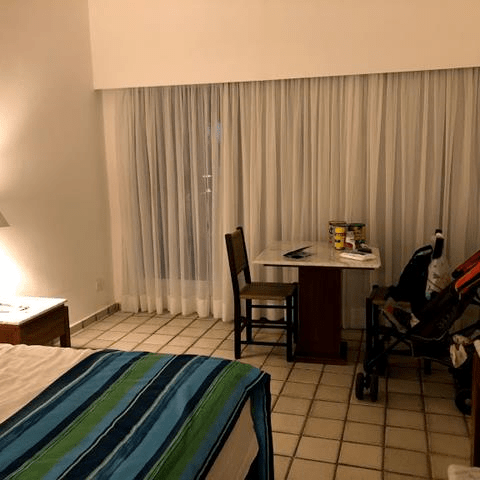 Nosso quarto tinha duas camas de casal, que juntamos e transformamos em uma super cama para o Bê dormir com a gente. Já no caso da Luiza, solicitamos no momento da reserva, e quando chegamos no quarto o bercinho já estava montado.