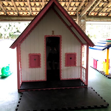 Além dessa área linda, fiquei encantada com espaço externo espetacular. Com muitos brinquedos de madeira, escorrega, gangorras, campo de futebol, um gramado enorme e uma piscina infantil.