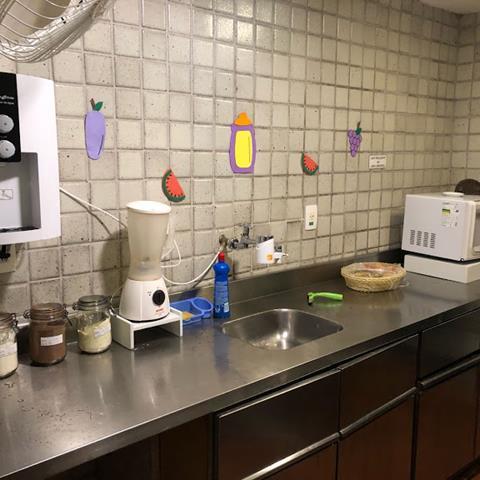 Também ficam disponíveis frutas e filtro de água, além de um liquidificador para as vitaminas.