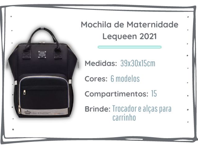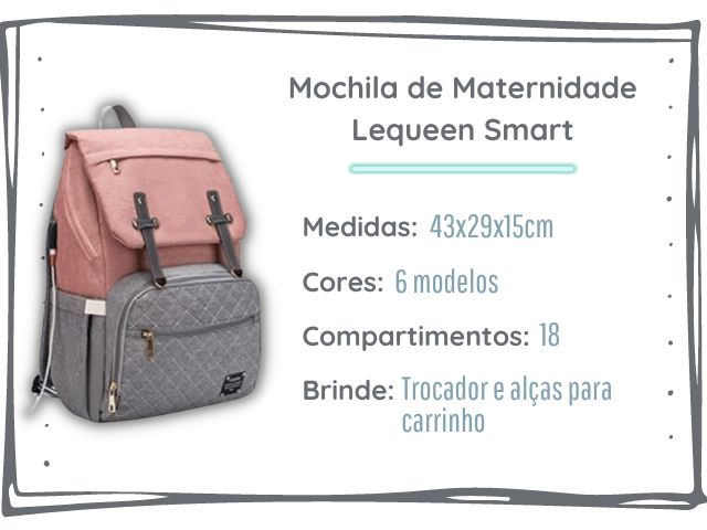 A Mochila de Maternidade Lequeen Smart faz muito sucesso entre as mamães e papais e caiu no gosto popular. Apesar de ser um pouco mais simples que as demais marcas, o material é de muita qualidade. A mochila é versátil, prática e moderna.
