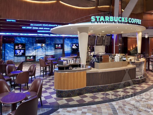 Existem alguns pontos de Starbucks espalhados pelo navio, mas a loja principal fica no deck 4 perto da pizzaria.