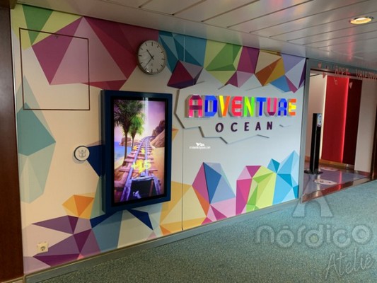 O Adventure Ocean é um clubinho infantil que ocupa espaços em 2 decks do navio e é o lugar onde as crianças podem ficar brincando com monitores.